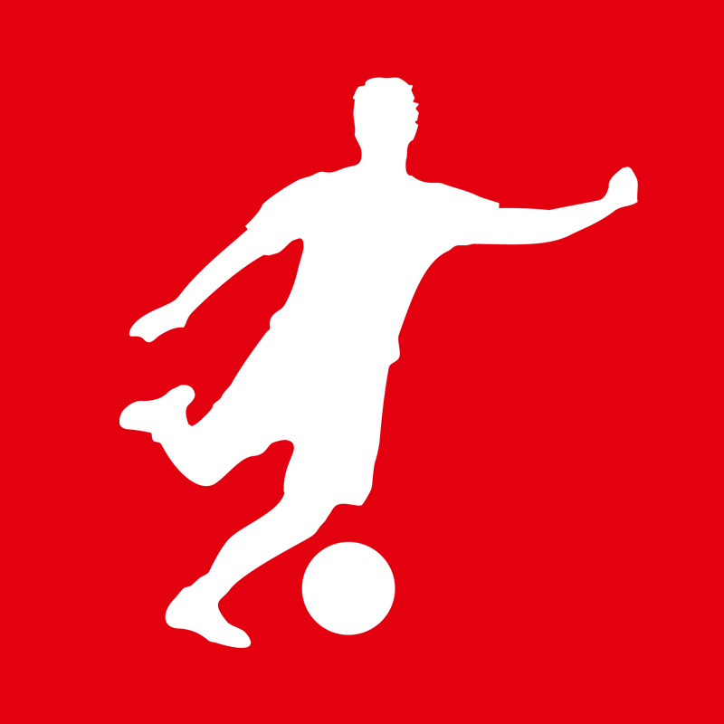 Roter Hintergrund mit einer weißen Silhouette (männlich) die einen Fußball am Fuß hat und zum schießen ausholt.