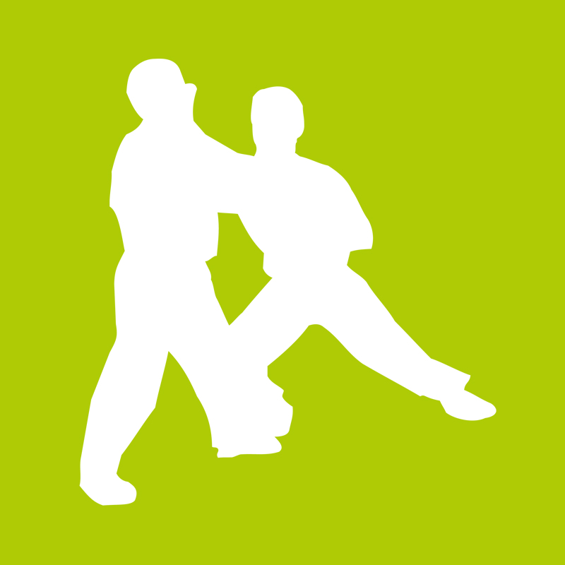 Hellgrüner Hintergrund mit zwei weißen Silhouetten (männlich), die Kampfübungen im stehen zusammen ausüben.