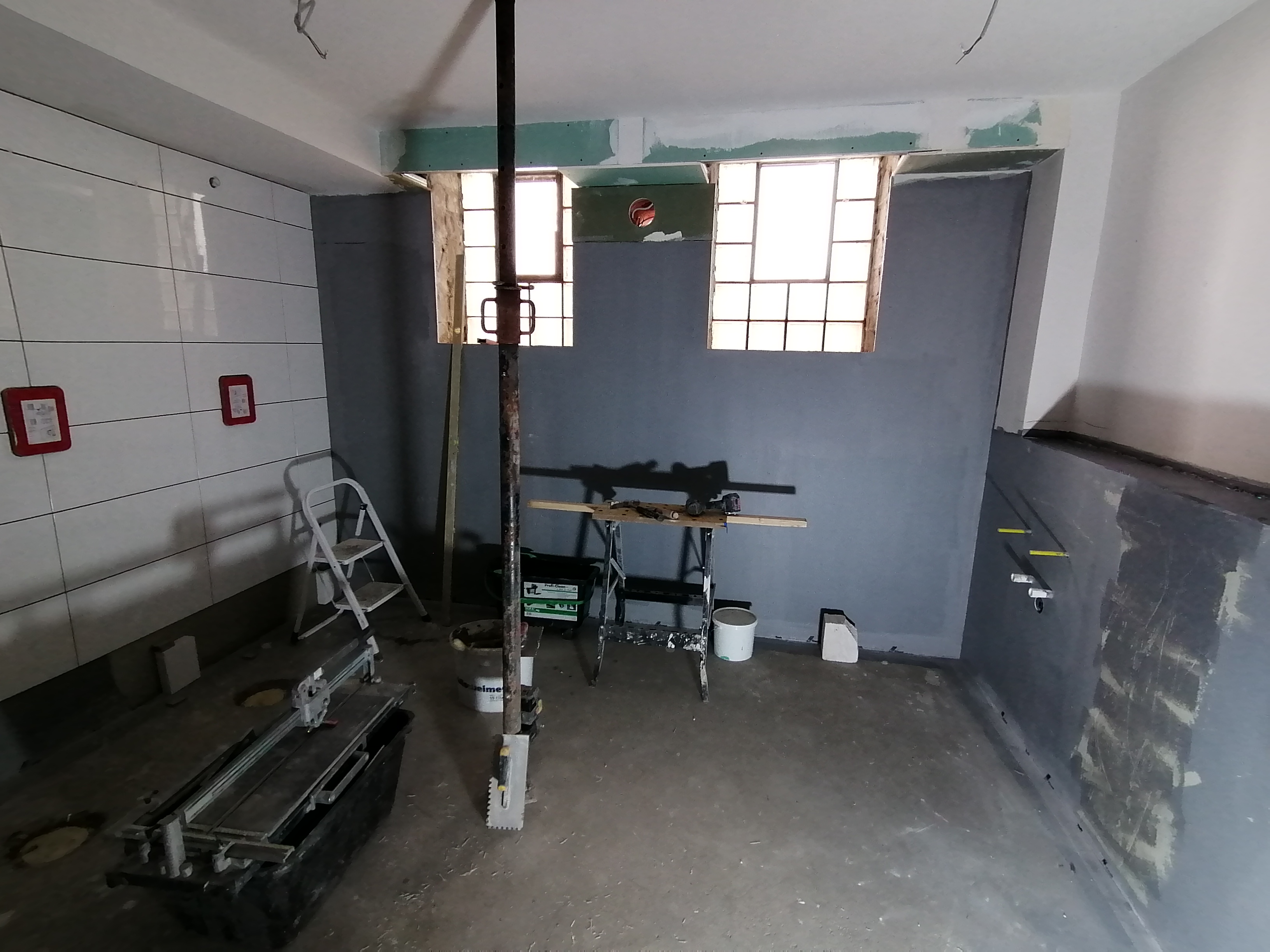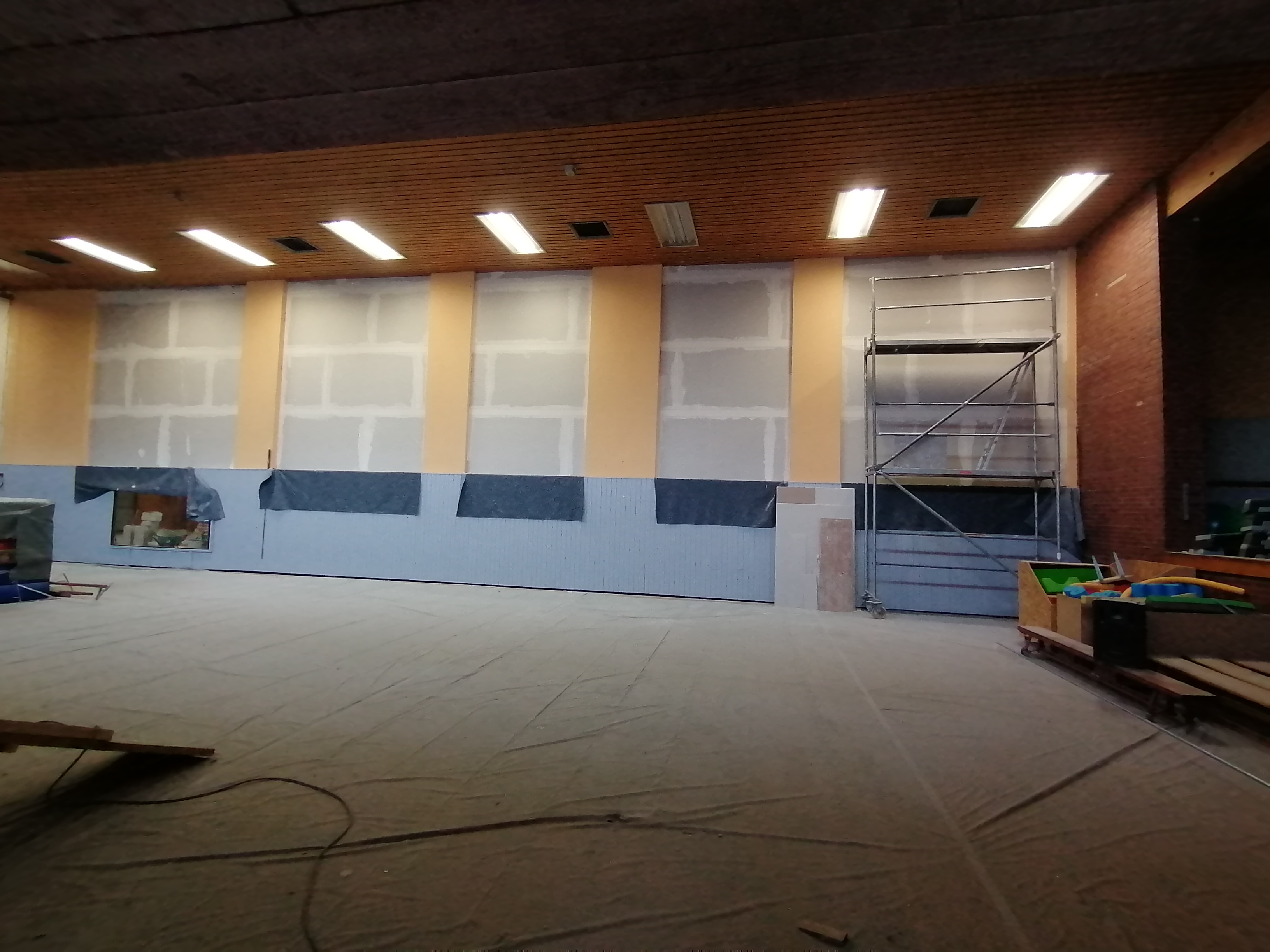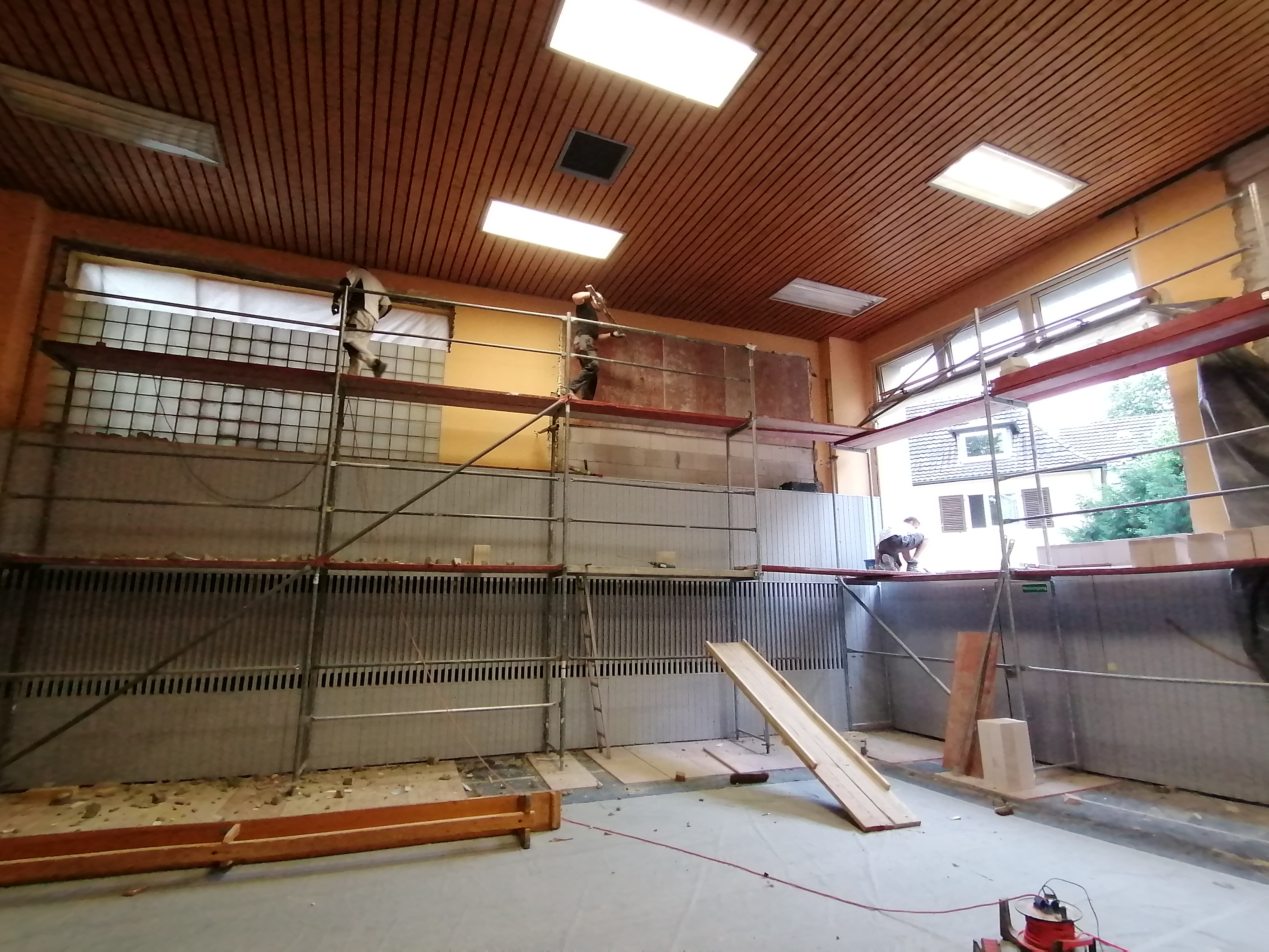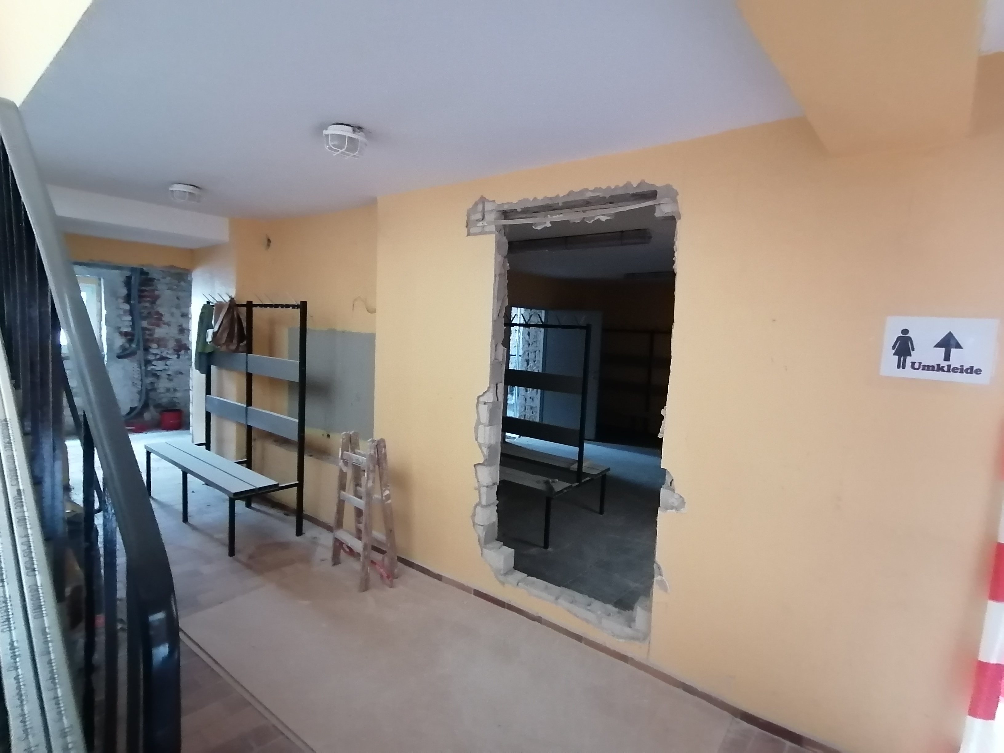 Stand 05.09.2023: Die Lieferung der Materialien dauert leider noch an, so dass die Hallennutzung aktuell nach den Herbstferien geplant ist. Im sanitären Bereich haben die Fliesenarbeiten begonnen.