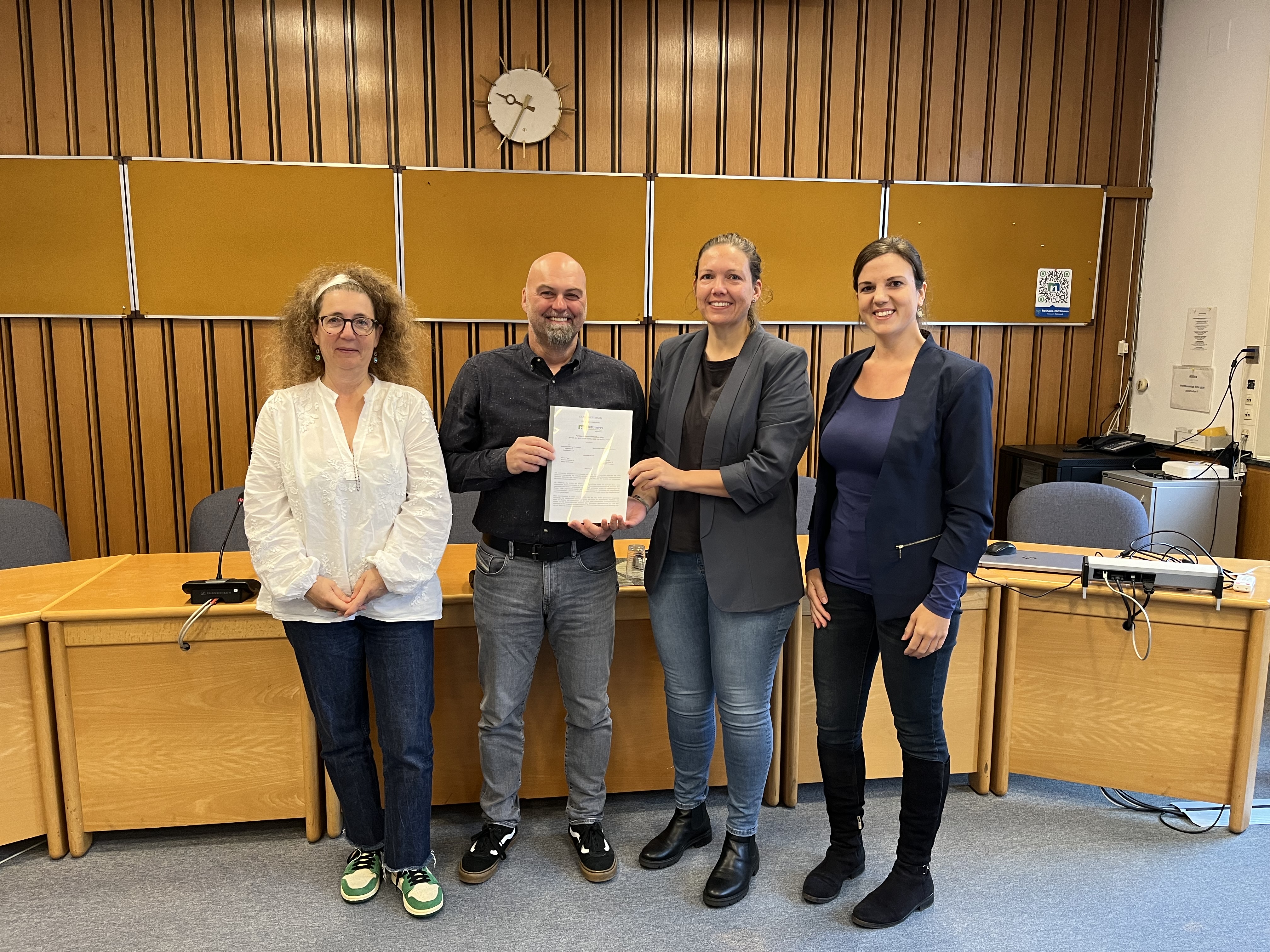 Michael Weigerding, Geschäftsführer Kreissportbund Mettmann e.V. und Sandra Pietschmann, überreichten die Plakette an Wilma Rohde, Präsidentin, und Laura Hayen, Vorstand (beide mettmann-sport e.V.), stellvertretend für die Arbeitsgruppe.